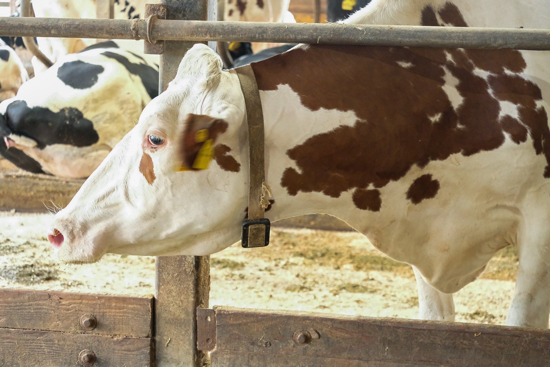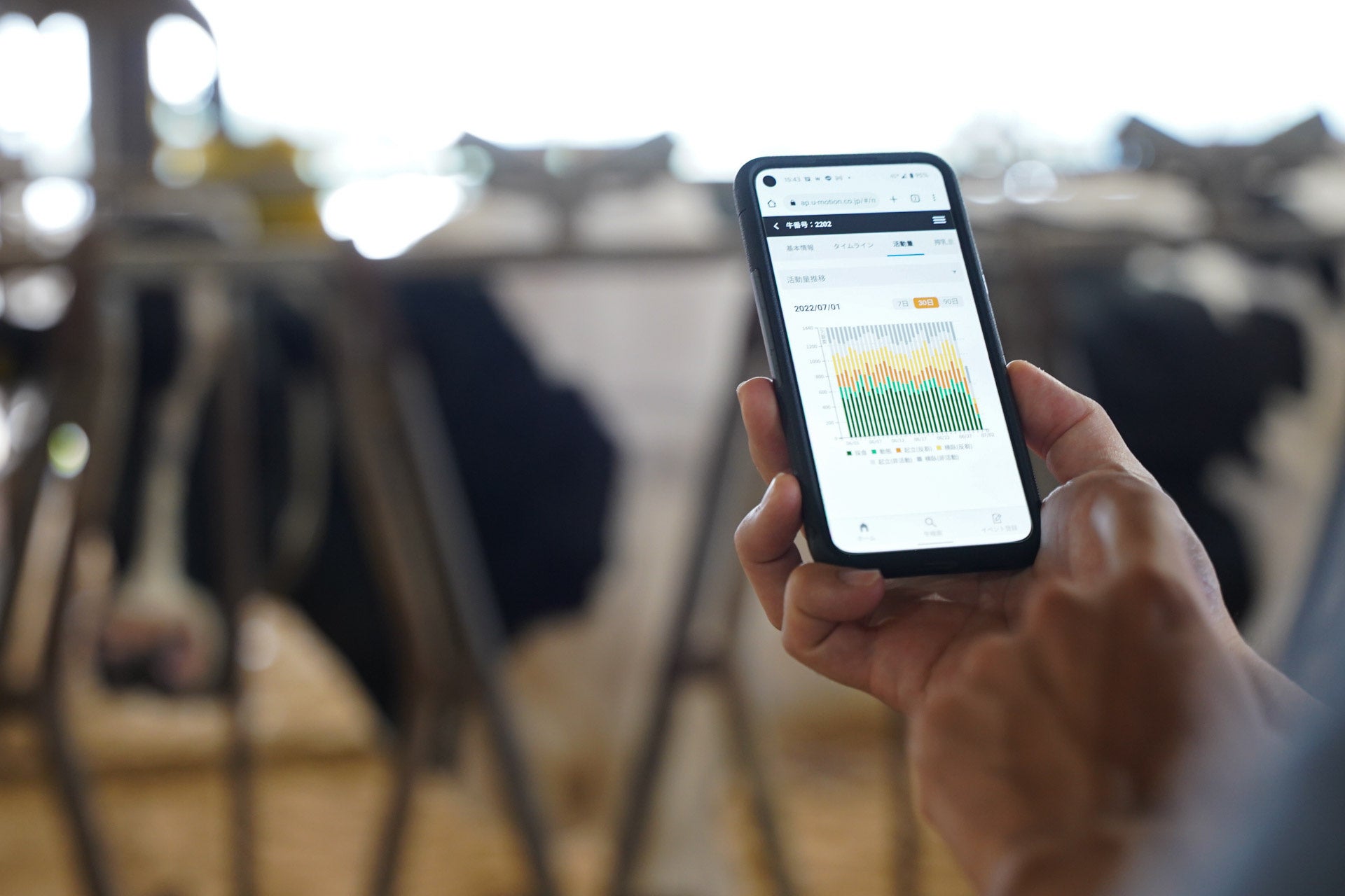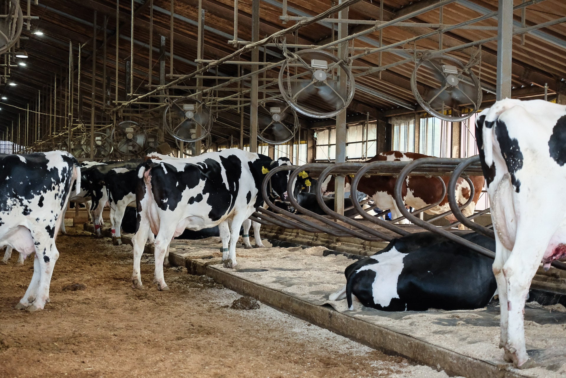 ▲牛1頭1頭は最新の牛群管理機器で健康状態から乳量まで丁寧に管理されている。朝霧メイプルファームの牛は健康で乳量が多く、平均1日40リットル近くを生産する。