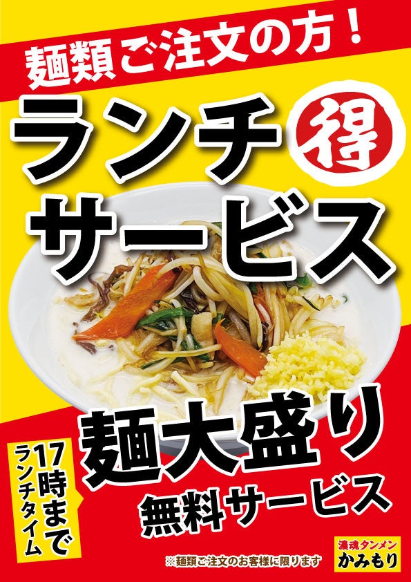 麺類ご注文のお客様には毎日17時まで麺大盛り無料サービスを実施中です! !