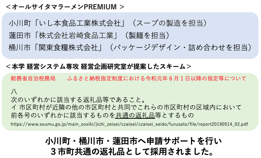 関東食糧株式会社(埼玉県桶川市 代表取締役社長:臼田真一朗)と埼玉工業大学(埼玉県深谷市 学長:内山俊一)は、「ふるさと納税返礼品」の連携企画において、人間社会学部 情報社会学科 経営システム専攻 本吉裕之研究室(経営企画研究室)所属学生が認定サポートを行い、埼玉県内3自治体(小川町、蓮田市、桶川市)共通の「ふるさと納税返礼品」として、「オールサイタマラーメンPREMIUM」が採用されました。(12月上旬より順次受付開始の予定)
