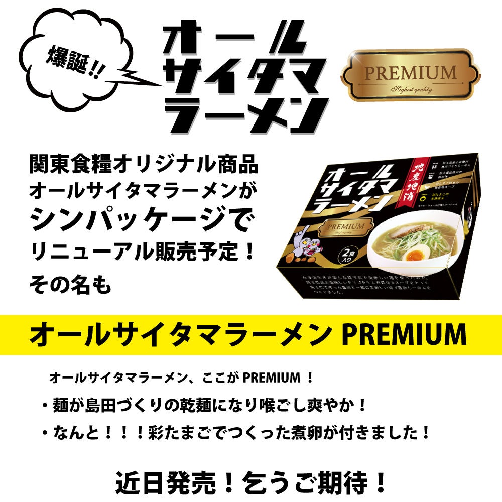「オールサイタマラーメンPREMIUM」心機一転、パッケージデザインもリニューアルし、内容も、生麺から乾麺に、トッピングで味玉もプラス。