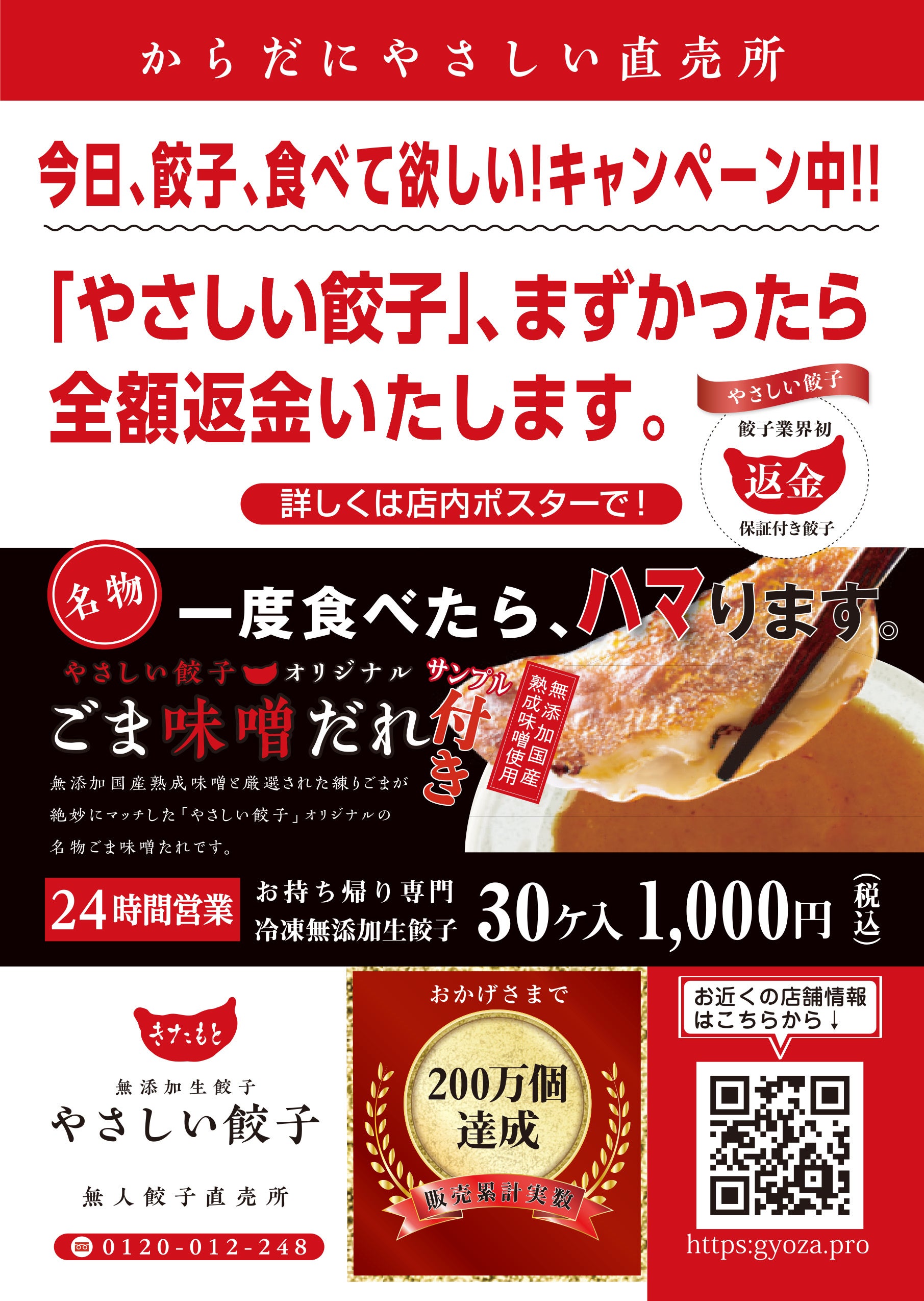全国に76店舗(2022年11月現在)を展開、2024年までに1000店舗を目標に今も店舗数拡大中の「やさしい餃子」が、無人餃子販売で初となる返金キャンペーンを実施します。