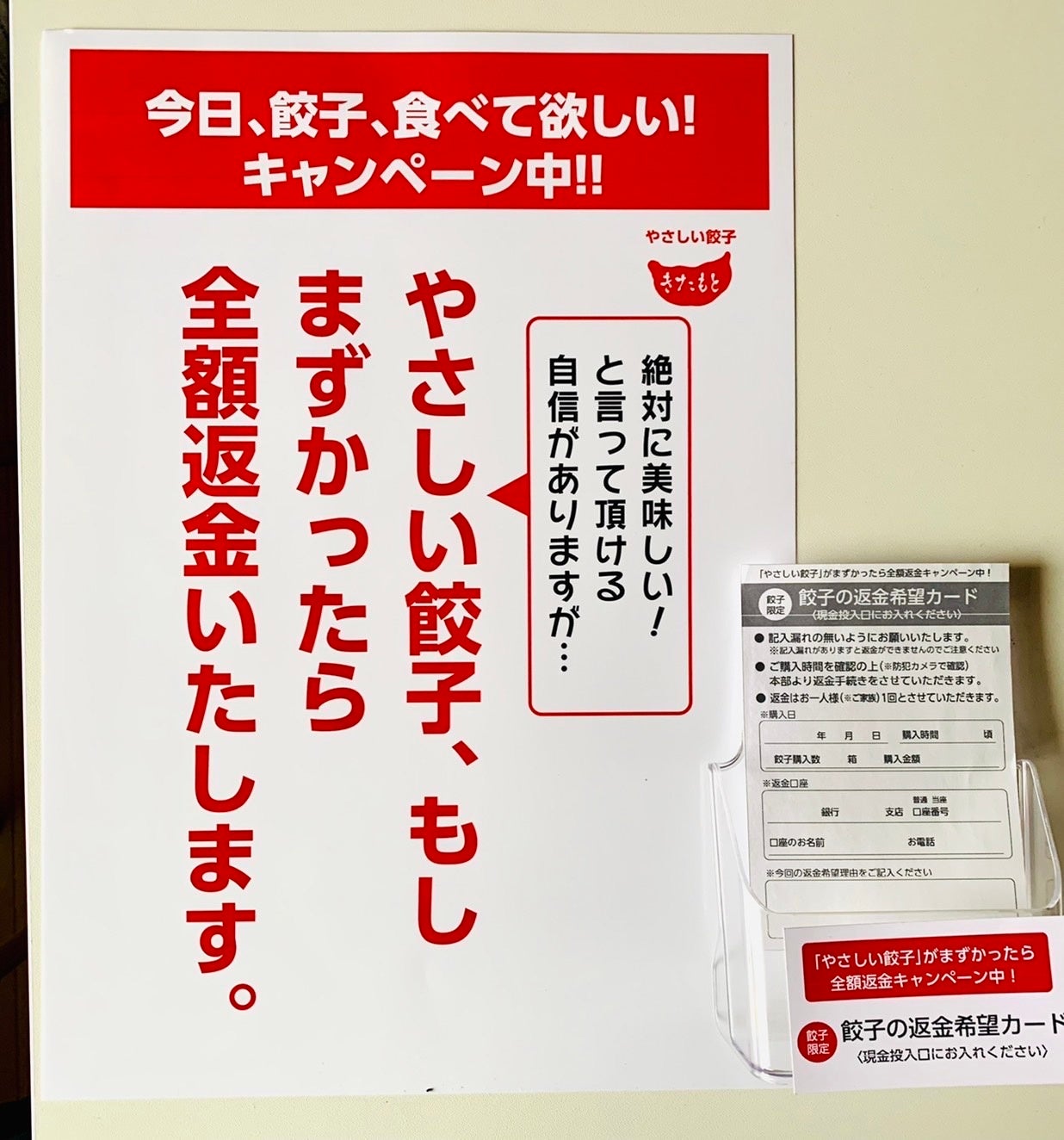 やさしい餃子の味にご満足いただけない場合は、店頭に設置してある餃子の返金希望カードへ記入し、現金投入口に入れていただくことで、ご応募いただけます。
