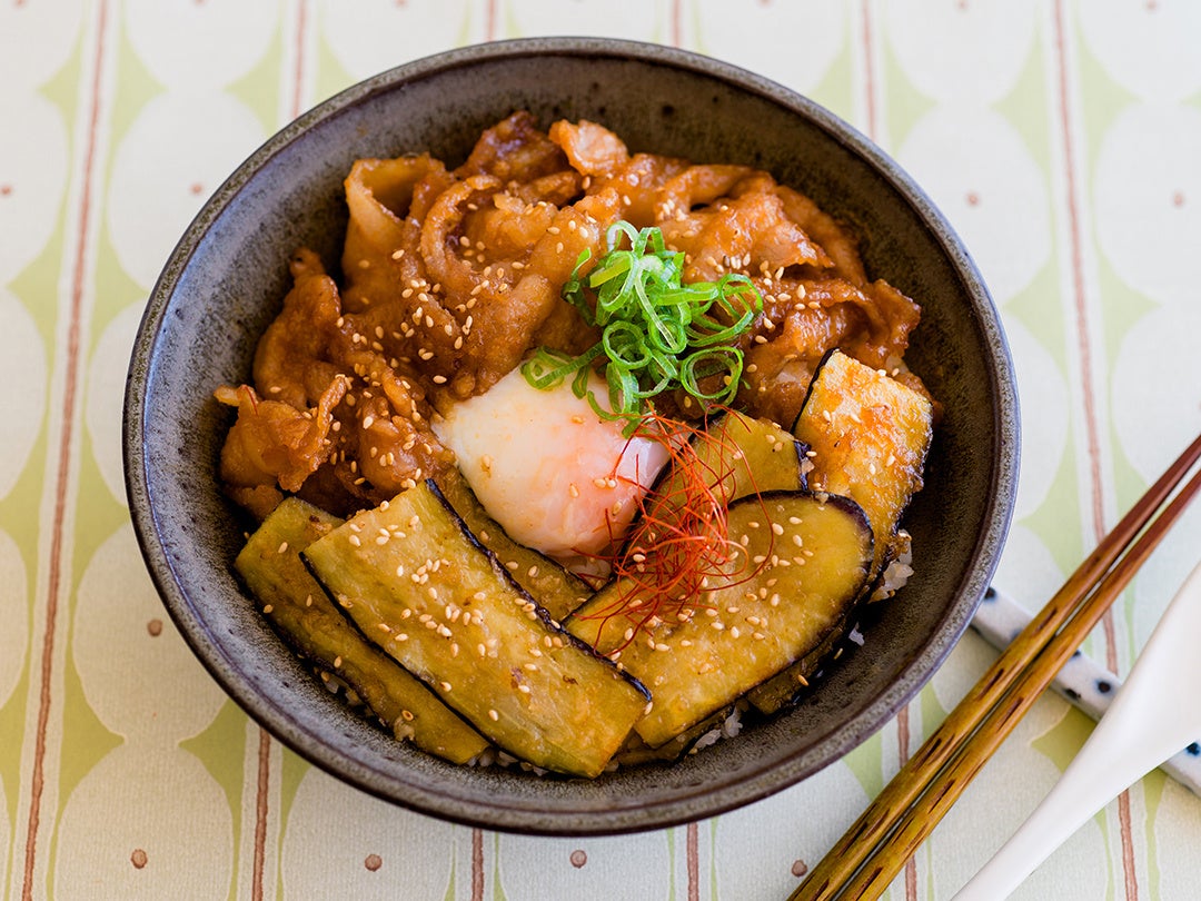 千両ナスをトロトロに焼き上げ、ごま風味に仕上げた豚バラと一緒にどんぶりに。 仕上げにとろり温泉たまご。