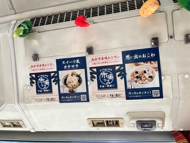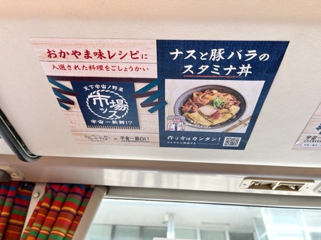 両備グループバスユニットが公共交通の再起を目指して推 進している「宇宙一面白い公共交通を目指すプロジェクト」(以下、宇宙一PJ)とコラボし、宇宙一PJが企画する特別車両“市場ッス”の車内にて、レシピのポスターを掲示しています。