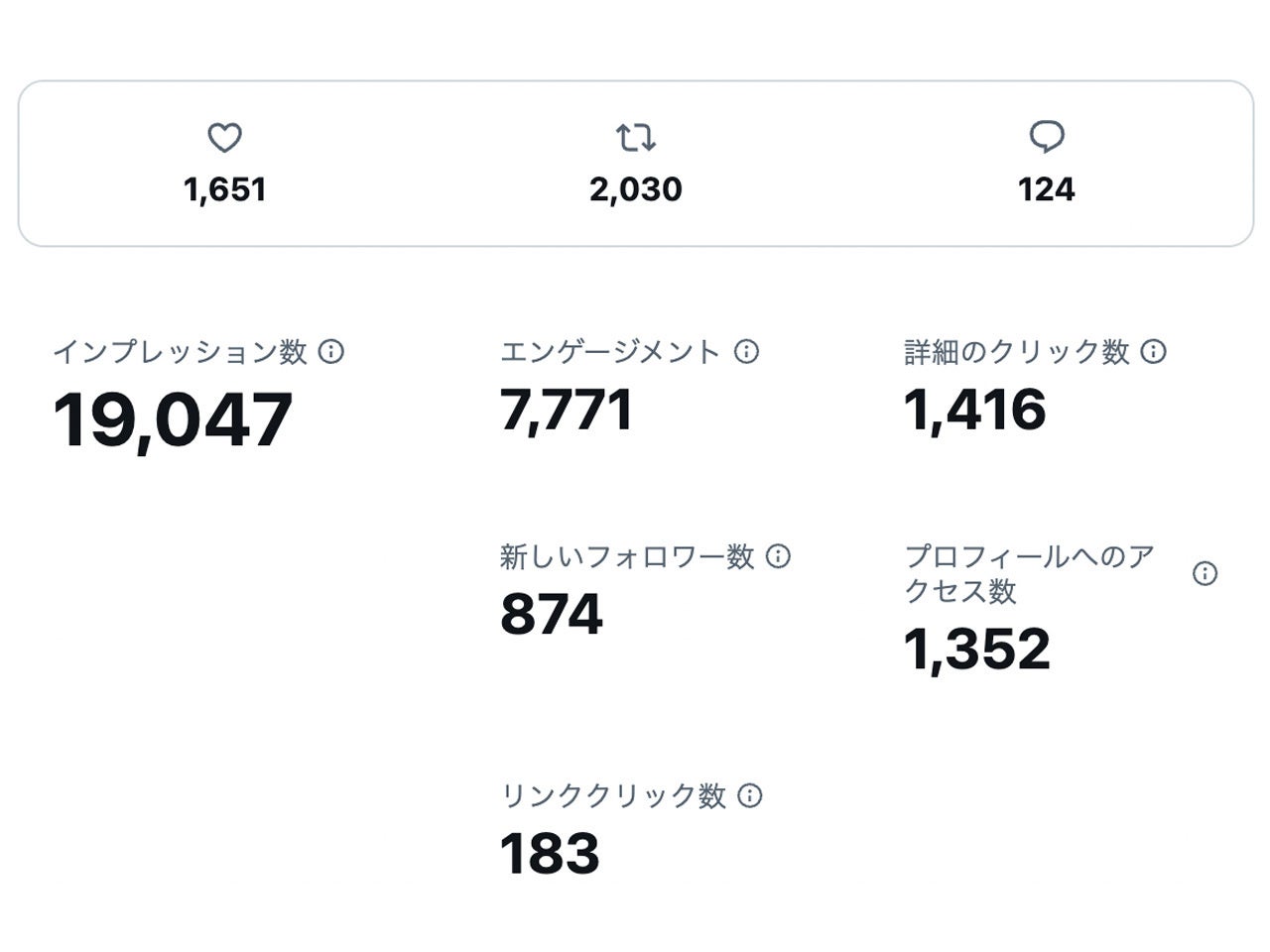 スクショ(ツイートアクティビティ、インプレッション、エンゲージメント、詳細のクリック数まで)