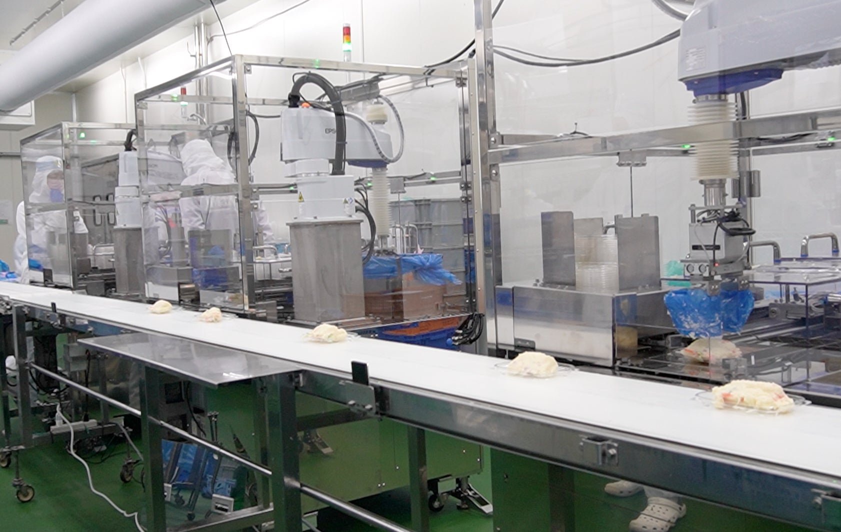 食品工場に4台導入された、惣菜盛り付けを自動化するロボットです。