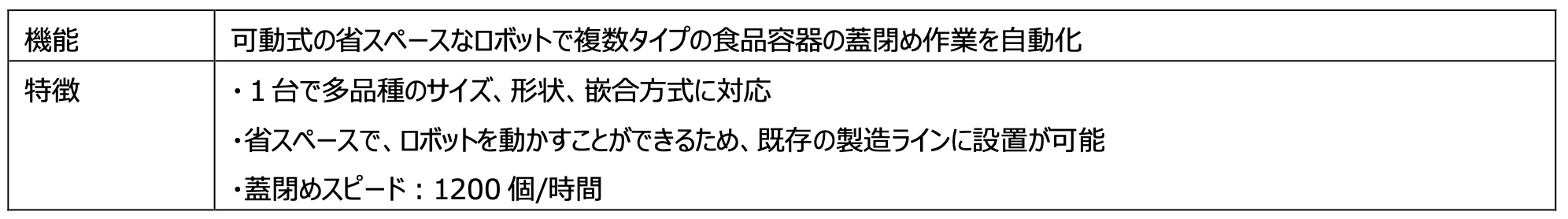 省スペースで可動式のロボットで高速に自動で惣菜/弁当などの食品容器の蓋を閉めるシステムです。
