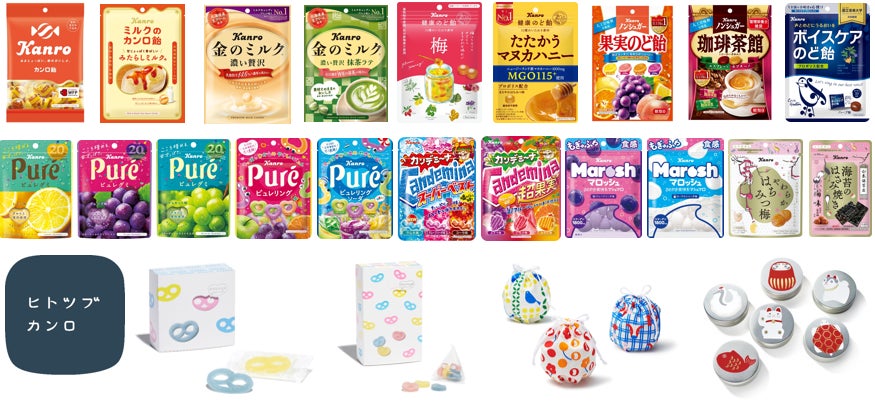 当社は創業から110年、社名になっている「カンロ飴」を始め、ミルクフレーバーキャンディ市場売上No.1ブランド※「金のミルク」、菓子食品業界で初ののど飴となる「健康のど飴」、大人の女性に向けたグミ市場を創り上げた「ピュレグミ」など、常に消費者の皆様から愛され続ける商品を創り続けてまいりました。2012年からは直営店「ヒトツブカンロ」を運営し、「ヒトからヒトへ つながる ヒトツブ」をコンセプトにキャンディの魅力を発信しています。