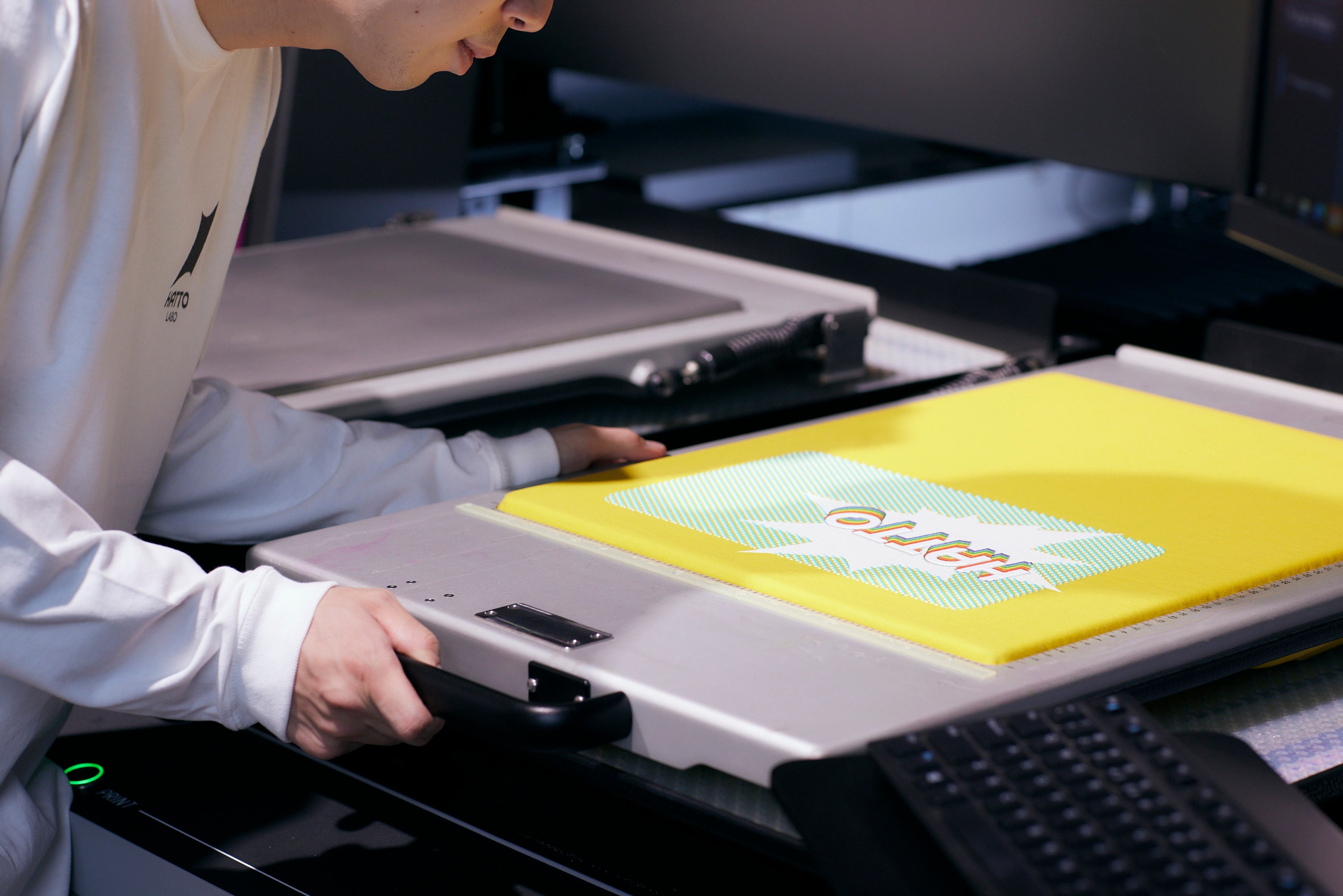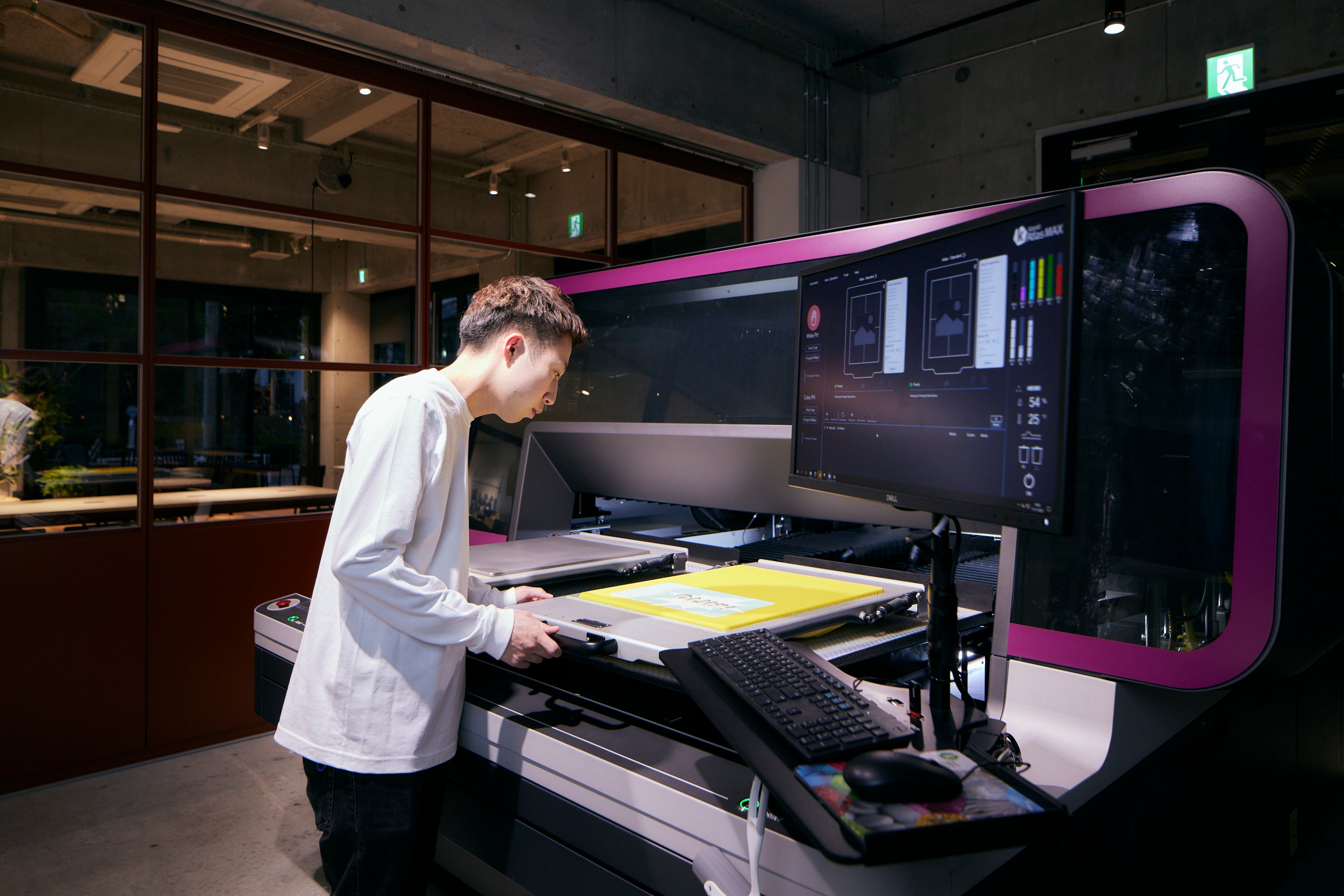 店内にあるプリンタ―、Atlas MAXの特徴は必要なときに必要な分だけプリントができる「オンデマンド」で、過剰在庫を出しにくい点です。まず作ってから売り方を考える「供給ファースト」ではなく、需要があってはじめてものづくりをする「需要ファースト」な考え方は、実はプラザクリエイトの創業事業である写真事業から来ています。お客様一人ひとりのそれぞれ違った1枚の写真を、受注を受けてから印刷するというモデルをアパレルにも転用したことで生まれた新事業です。