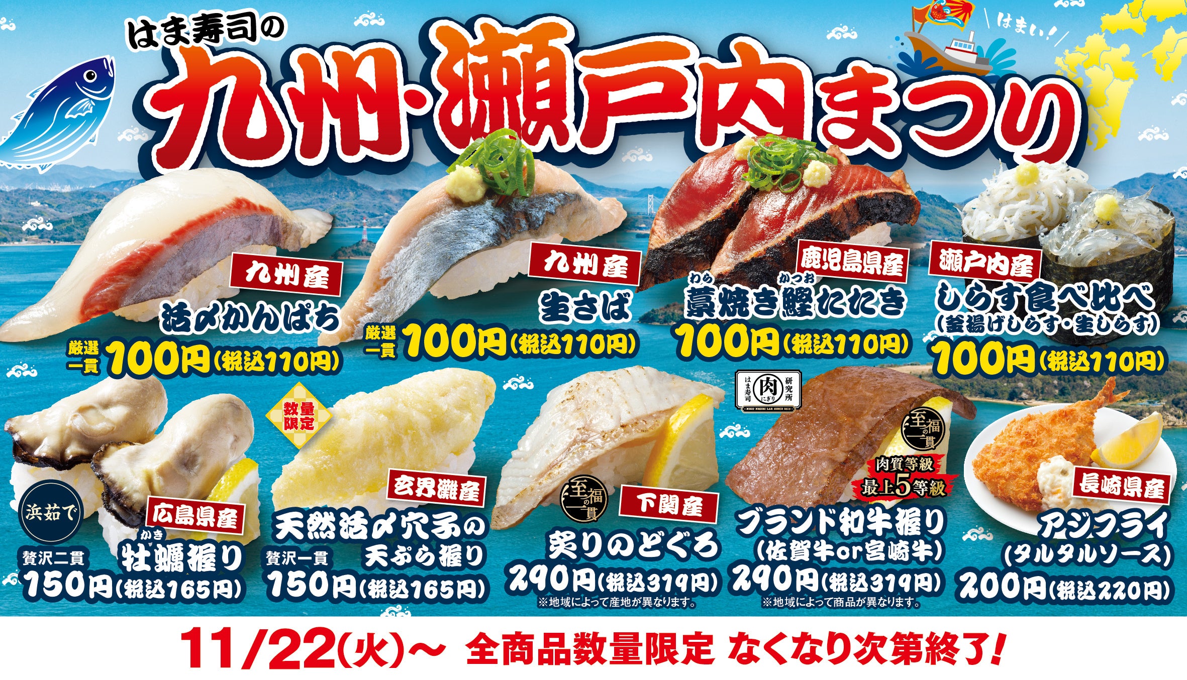 株式会社はま寿司(代表取締役社長:遠藤 哲郎 本社:東京都港区)が展開する100円寿司チェーン「はま寿司」は、11月22日(火)から「はま寿司の九州・瀬戸内まつり」を全国の店舗で開催します。