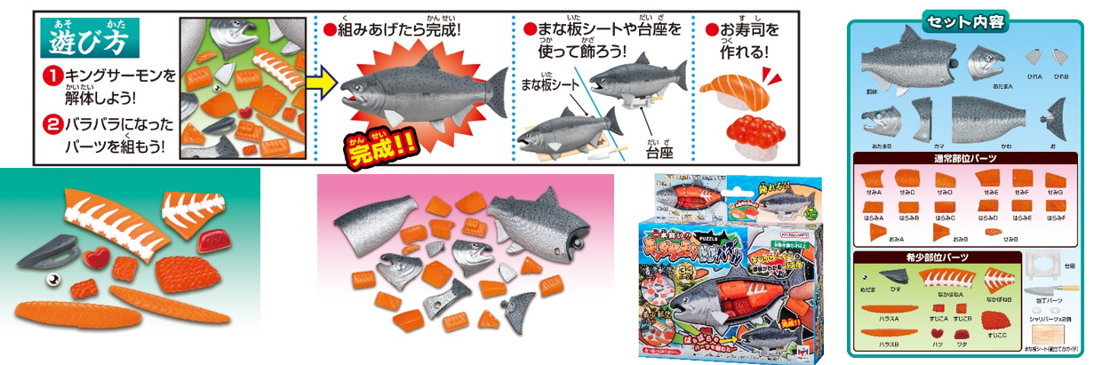 「一本買い!!キングサーモン解体パズル」は、キングサーモンの部位がわかる立体パズルです。全34パーツの構成で、“はらみ”等のお馴染みの部位から“ハラス”や“すじこ”の希少部位パーツもあります。部位を組み合わるパズルとして遊ぶのはもちろん、包丁で解体したり、付属のシャリパーツに“すじこ”や“せみ”をのせてお寿司作り、まな板シートや台座で飾ることもできます。