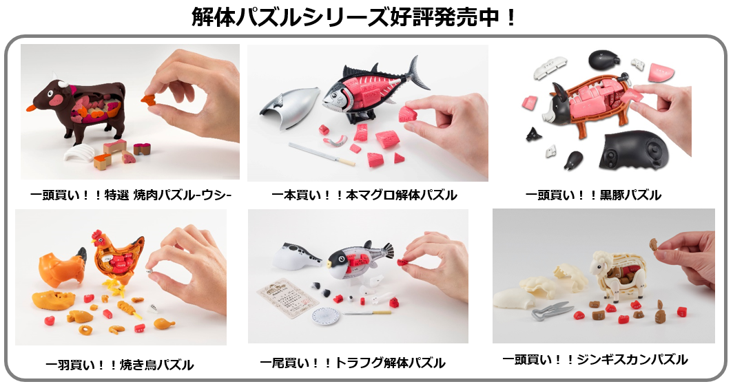 『解体パズル』シリーズは、遊びながら食材の部位を学べる立体型のパズルで、実物とほぼ同じ位置に各パーツが並んでおり、部位の名称と位置が一目瞭然でわかります。パーツを組み立てるパズル本来の遊びはもちろん、「飾っても可愛い」「部位の場所と形がわかって勉強になる」「パーツに部位名が書かれてあるのが良い」「子供から大人まで楽しめる」等、幅広い年代の方から、さらには国内外から好評を得ております。