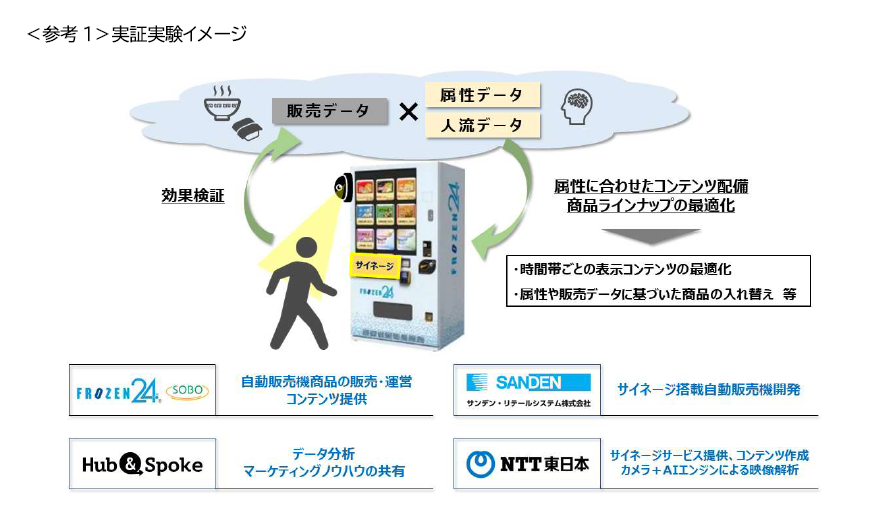 株式会社SOBO(代表取締役:益川大平、以「SOBO」)、株式会社ハブアンドスポーク(代表取締役:遠藤洋彦、以下「ハブアンドスポーク」)、サンデン・リテールシステム株式会社(代表取締役社長:森 益哉、以下「サンデンRS」)、東日本電信電話株式会社宮城事業部(執行役員宮城事業部長:滝澤 正宏、NTT東日本」)は、AIカメラ映像解析技術を活用した映像解析データと冷凍自動販売機の商品販売データ分析を基に、デジタルサイネージの冷凍自動販売機商品の売上向上への有用性を検証する実証実験を開始します。