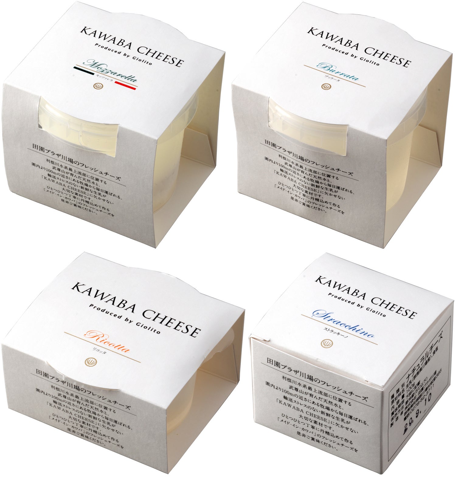 製造に欠かせない水も、武尊山が育んだ天然水を使用。日本で作る、本場イタリアのフレッシュチーズ「モッツァレラ」「ブッラータ」「リコッタ」「ストラッキーノ」の4種類を是非お試しください。