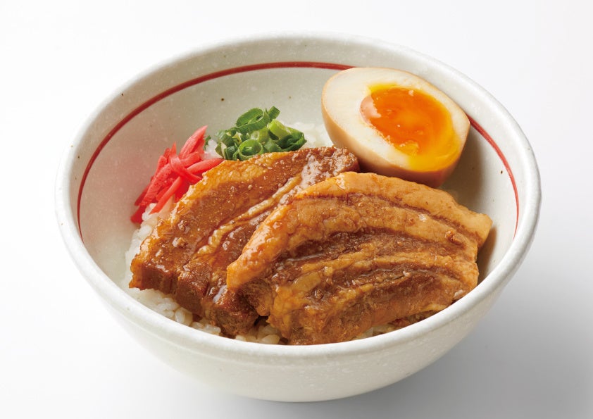 豚角煮、人気の煮玉子半分、ねぎをトッピング。甘辛タレがご飯によく合い食欲をそそります