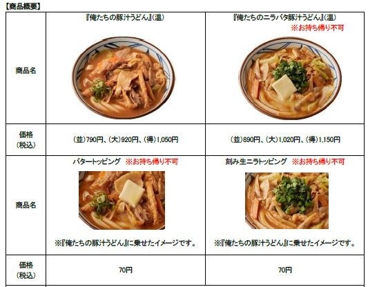 今回、新発売となる『俺たちの豚汁うどん』の開発は、固定観念にとらわれず、常に新しい挑戦をし続ける両社だからこそ、そして、長年豚汁のおいしさに魅了されてきた株式会社TOKIOとだからこそ実現されました。「共創型パートナーシップ」2年目のこの冬に、日本の冬の国民食「豚汁」という食べ物で、丸亀製麺の打ち立てうどんに最高に合う新しい豚汁をご提案。世の中に新たな食のおいしさや感動を与えていきたいと考えています。丸亀製麺と株式会社TOKIO は、「うどんで日本を元気にしたい」という想いのもと、「これが豚汁?」と驚くようなうどんに最高に合う豚汁を目指しました。丸亀製麺と株式会社TOKIO のこだわりと想いが詰まった、この冬にぴったりの『俺たちの豚汁うどん』をぜひご賞味ください。