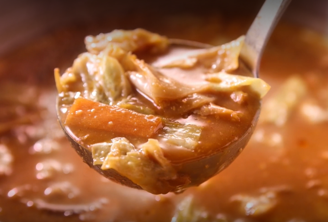 そして、丸亀製麺のだしに複数をブレンドしたこだわりの味噌と隠し味となるコチュジャンをあわせて、さらにたっぷりの豚肉と具材が入った鍋に溶かし入れていき、3名はわくわくした表情で丹精込めて特製の味噌だしをつくります。