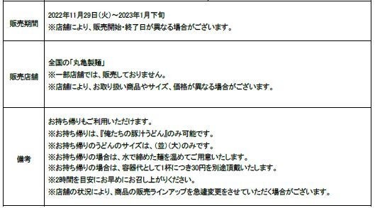 株式会社丸亀製麺(本社:東京都渋谷区、代表取締役社長:山口 寛)が展開する讃岐うどん専門店「丸亀製麺」は、株式会社TOKIOの松岡昌宏さんと共同開発をした『俺たちの豚汁うどん』を2022年11月29日(火)より全国の丸亀製麺にて期間限定で販売いたします。また、共に構想を練った株式会社TOKIO(本社:東京都港区、社長:城島 茂)の3名が出演する新TVCM「俺たちの豚汁うどん ティザー篇」を11月26日(土)から11月28日(月)の3日間、11月29日(火)からは「俺たちの豚汁うどん 本告篇」も全国(一部の地域を除く)で放送開始いたします。