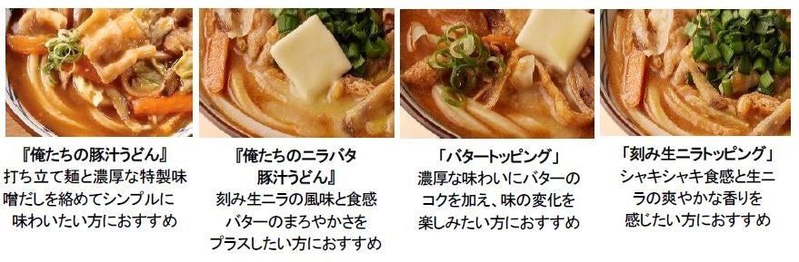 『俺たちの豚汁うどん』は、限定トッピングを追加して、4種の味わいを楽しんでいただけます。刻み生ニラとバターを合わせた『俺たちのニラバタ豚汁うどん』は、刻み生ニラの食感と風味、熱々の特製味噌だしの上で溶けるバターのコクと香りが加わり、さらにやみつきになる一杯です。お好みでバターのみ、刻み生ニラのみのトッピングもご用意しております。