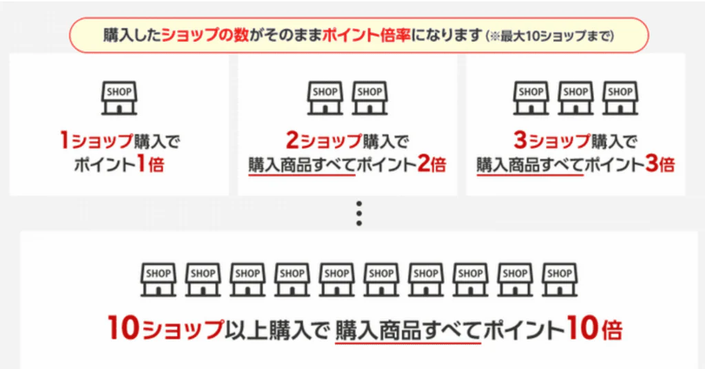 ④買い物するショップの数が多いほどポイント倍数が増え、10店舗で10倍に!