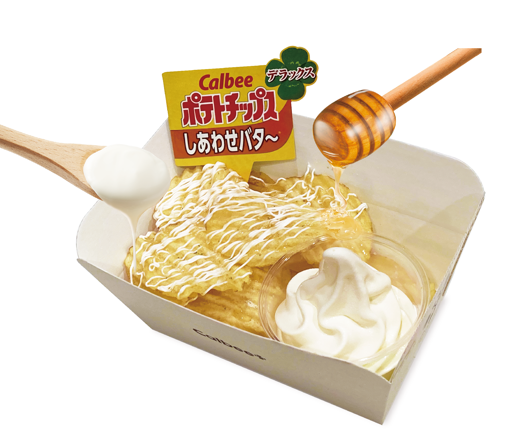 商品説明:揚げたてのポテトチップスをカルビーの人気の味、「しあわせバタ~」で味付けし、さらにマスカルポーネチーズとはちみつをトッピングしたカルビープラスでも人気の季節限定メニューです。ソフトクリームと一緒に食べることで、さらに「しあわせ」な味わいに。
