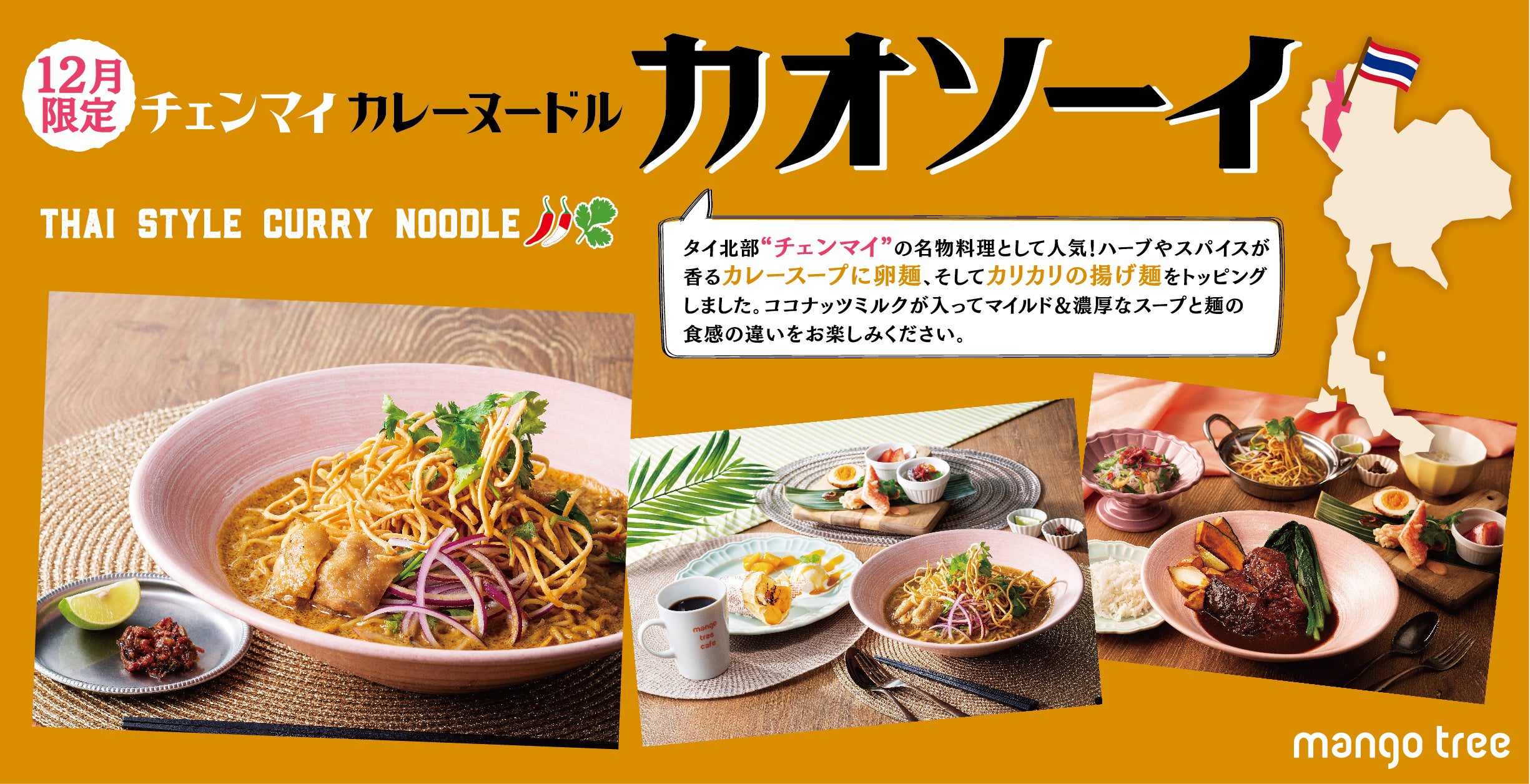 アークランドサービスホールディングス株式会社の子会社、海外の本場の味を日本で展開する株式会社ミールワークス(本社:東京都千代田区、代表取締役社長:小島 一生)は、タイ・バンコクに本店をもつ「マンゴツリー」の姉妹店で本格タイ料理を日常的に楽しめる「マンゴツリーカフェ」と「マンゴツリーキッチン」で、2022年12月1日(木)から31日(土)まで「チェンマイカレーヌードル “カオソーイ”」を、コースや単品など各ブランドに合わせて販売いたします(一部店舗除く)。