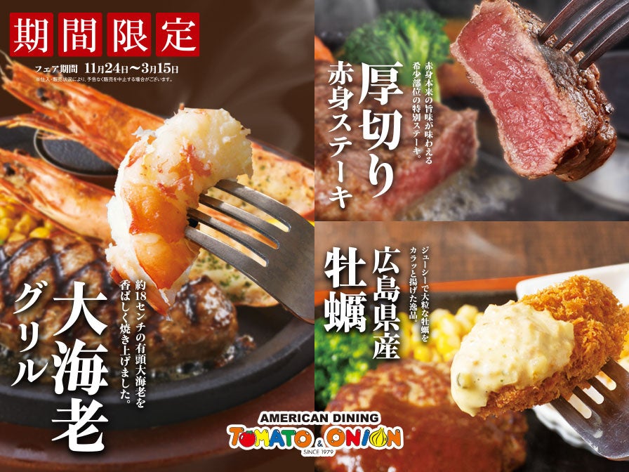 株式会社トマトアンドアソシエイツ(本社:兵庫県西宮市、代表取締役社長:小林 大二)が運営する、洋食レストラン「トマト&オニオン」では、2022年11月24日(木)から「大海老グリル」「広島県産牡蠣」「厚切り赤身ステーキ」を使用した『冬の贅沢ごちそうフェア』を開催いたします。
