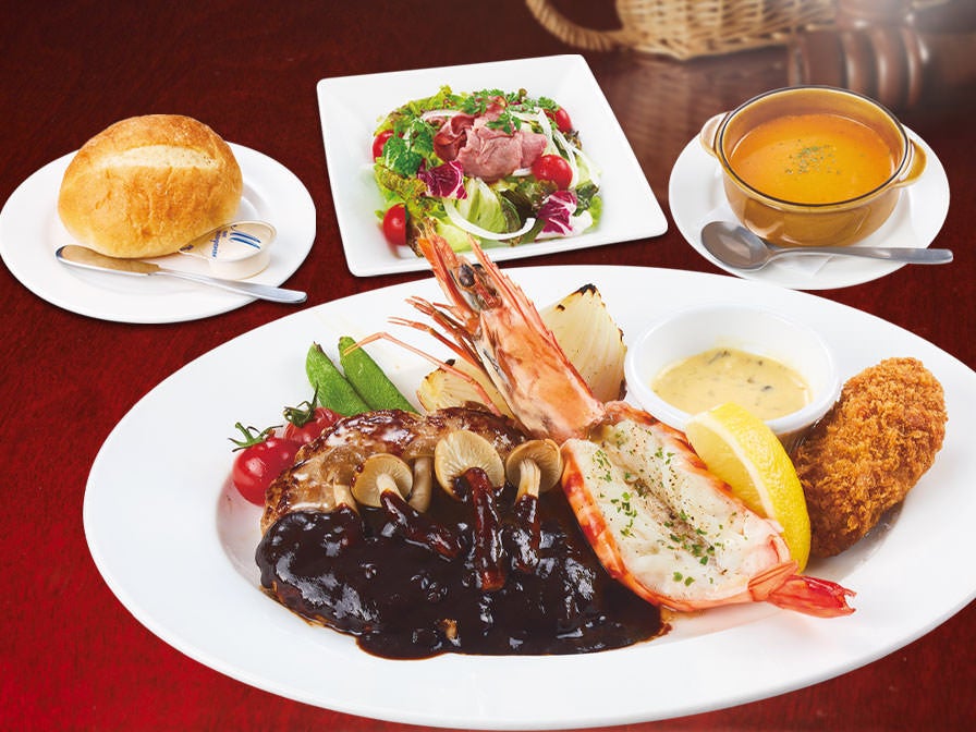 有頭大海老と広島県産牡蠣にハンバーグが楽しめる、1度で3度美味しいフェアセットはいかがでしょうか。