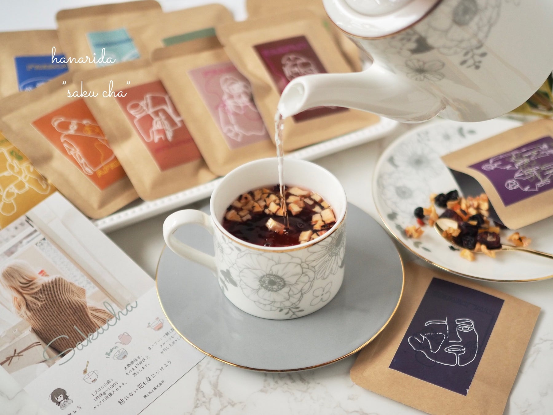 咲茶(さくちゃ)は、ドライフルーツがたっぷり入ったフルーツティーです。飲んで楽しむのはもちろんのこと、封を開けた瞬間から漂う完熟フルーツの香りや、ドライフルーツの食感もお楽しみいただけます。