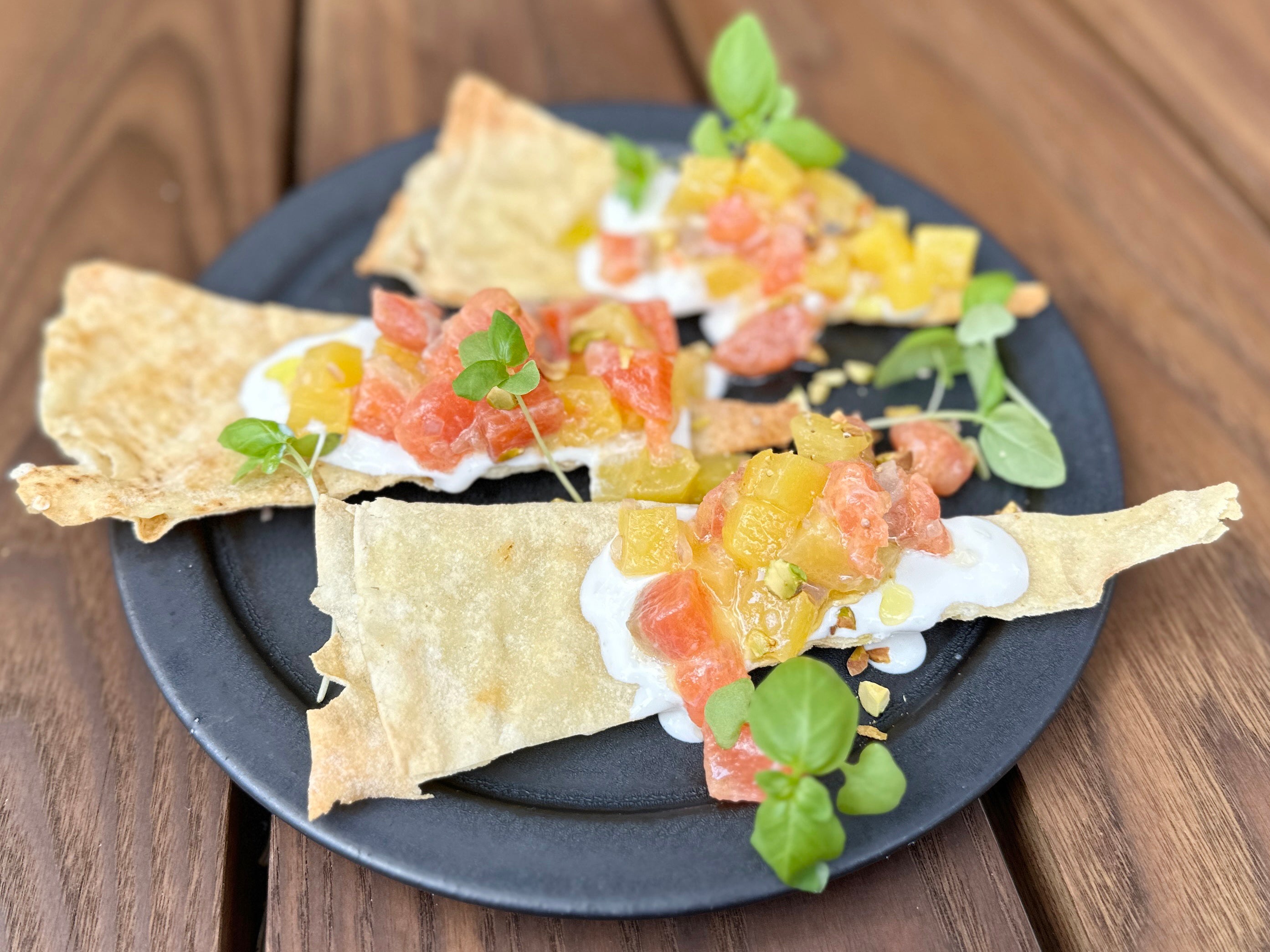 KNOCKオリジナルの生地“PICICA・PICICA”に、パイナップルが主役のサルサ風がたっぷりと乗せられた一品。Dole「スウィーティオパイナップル ゴールド」の絶妙な酸味と甘さが湧水サーモンとの相性も抜群で、前菜としても、ワインのお供としてもピッタリです。