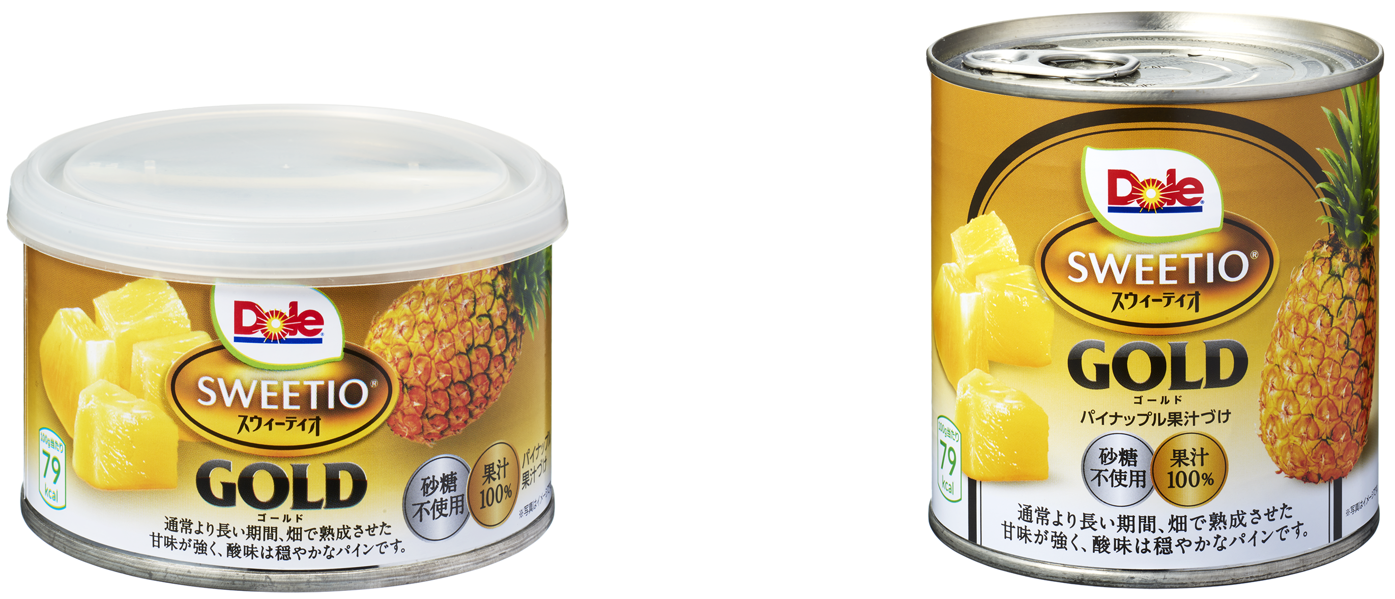 通常ラインナップのパイン缶『スウィーティオパイナップルチャンク』では「スウィーティオパイナップル」を使用していますが、『スウィーティオパイナップル ゴールド缶』には贅沢に「スウィーティオパイナップル ゴールド」を使用した、さらにリッチなパイン缶となっております。