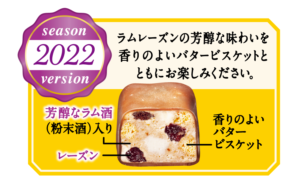 昨年もローソン先行で発売しご好評いただき、今年は本商品をリニューアルして発売いたします。今年はさらに本格的なラムレーズンの味わいを目指し、ラム酒を使用した3種の素材を組み合わせることで芳醇なラム感をお楽しみいただける一粒に仕上げております。