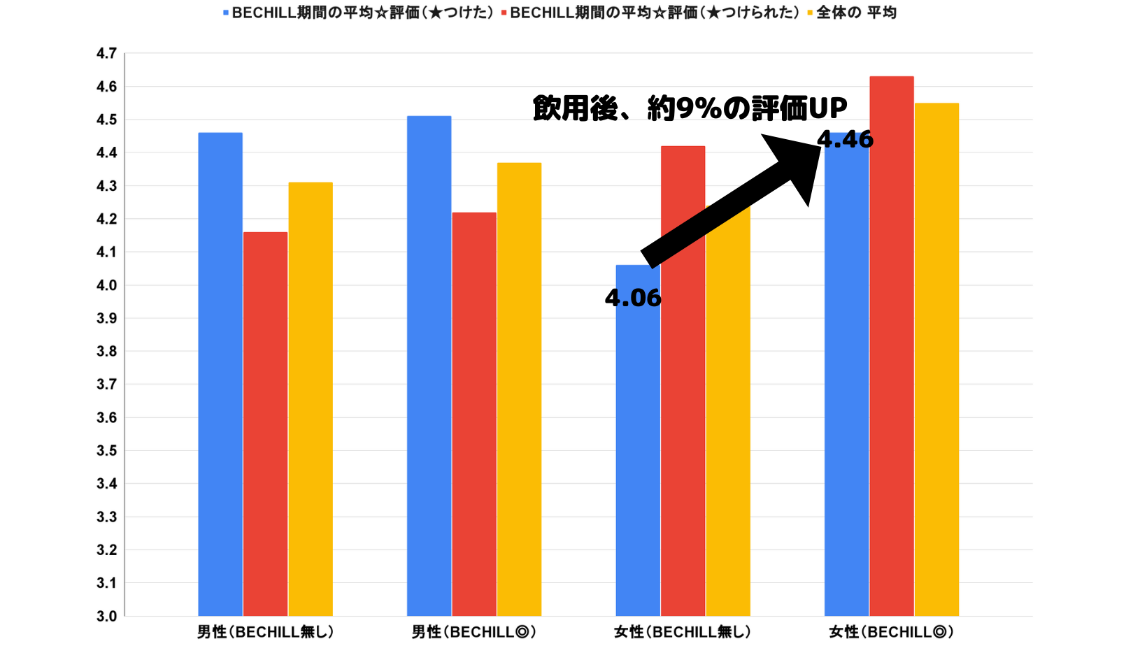 BECHILLを飲んだお客様は、女性から男性への評価が平均で9%高くなった。