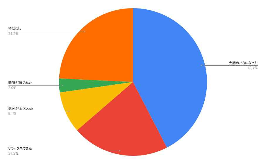 Q1で「少し緊張した」と回答された方の64%、「緊張した」と回答された方の75%が「会話のネタになった」「リラックスできた」と回答しました。