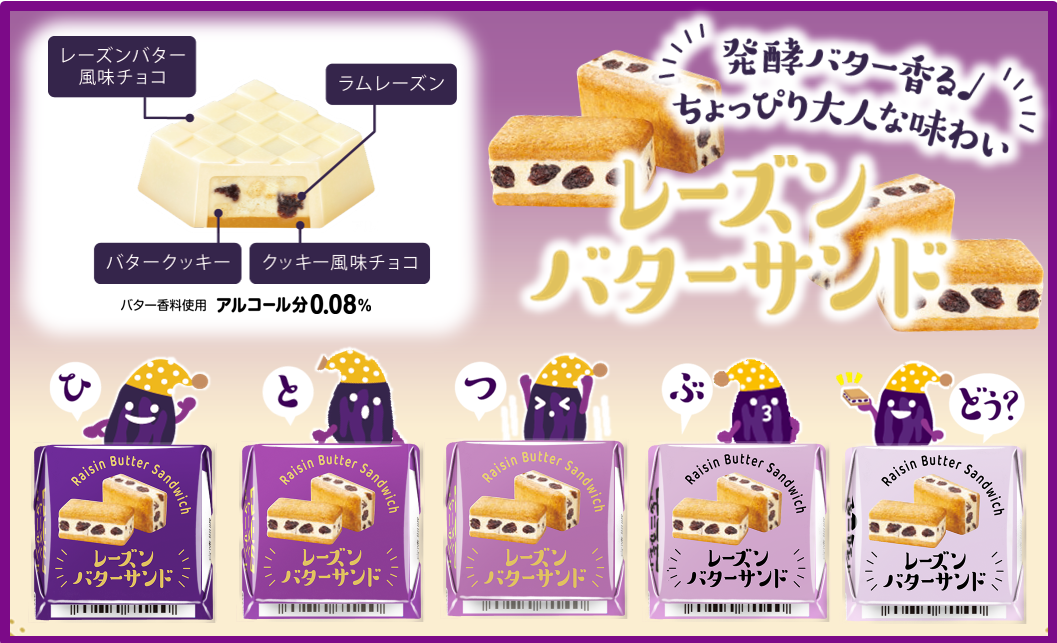 レーズンバター風味チョコで、バタークッキーとラムレーズンを包みました。