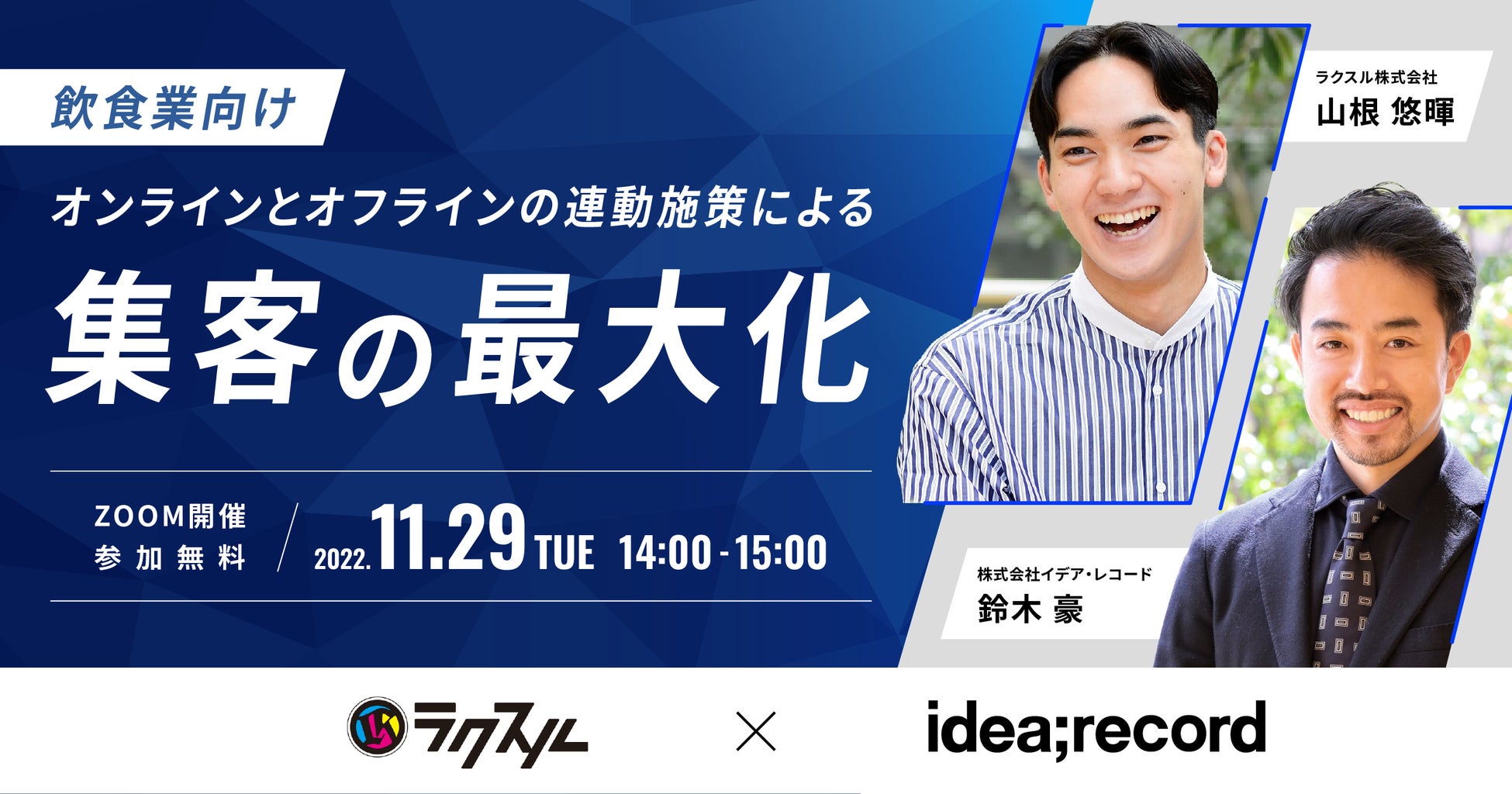 外食ビジネス向けに業務支援サービスの開発・提供を行う株式会社イデア・レコード(本社:東京都新宿区、代表取締役社長:柏田 康雄、以下:当社)は、印刷・集客のシェアリングプラットフォームを展開するラクスル株式会社(本社:東京都品川区、代表取締役社長CEO:松本恭攝、以下:ラクスル)との共催で、2022年11月29日(火)14:00~より飲食店業界に向けた集客アップセミナー「オンラインとオフラインの連動施策による集客の最大化」を開催します。