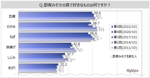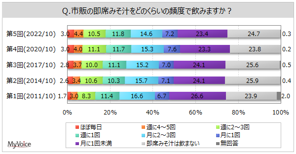 マイボイスコム株式会社(東京都千代田区、代表取締役社長:高井和久)は、5回目となる『即席みそ汁』に関するインターネット調査を2022年10月1日~5日に実施しました。調査結果をお知らせします。
