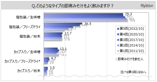 即席みそ汁飲用者がよく飲むタイプは(複数回答)、「個包装/生味噌」が75.3%となっています。「個包装/フリーズドライ」は36.5%、過去調査と比べて増加傾向です。