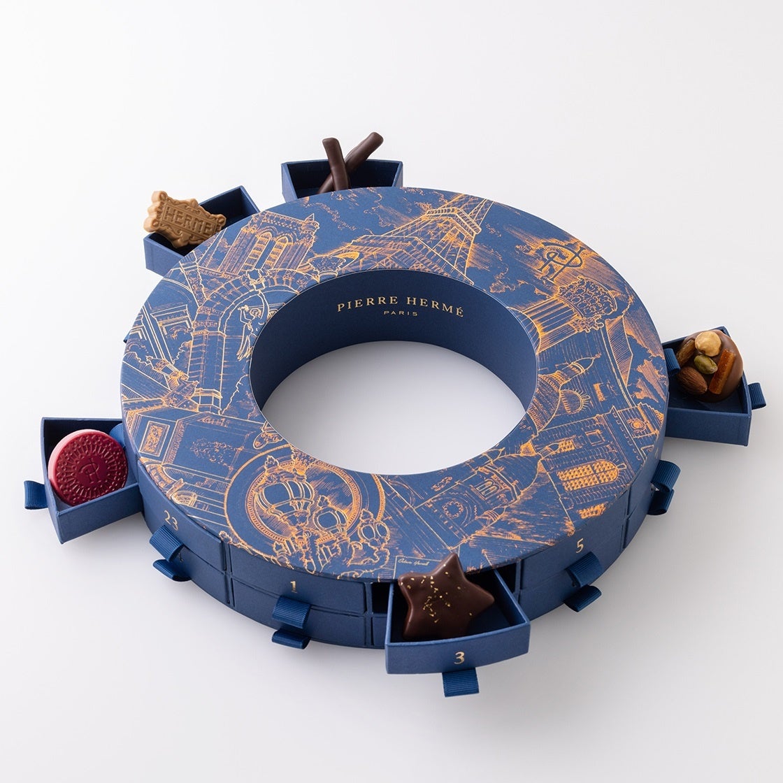 優雅なクリスマスリースの形のアドベントカレンダーには、24種のショコラやサブレ、パンデビスが入っています。