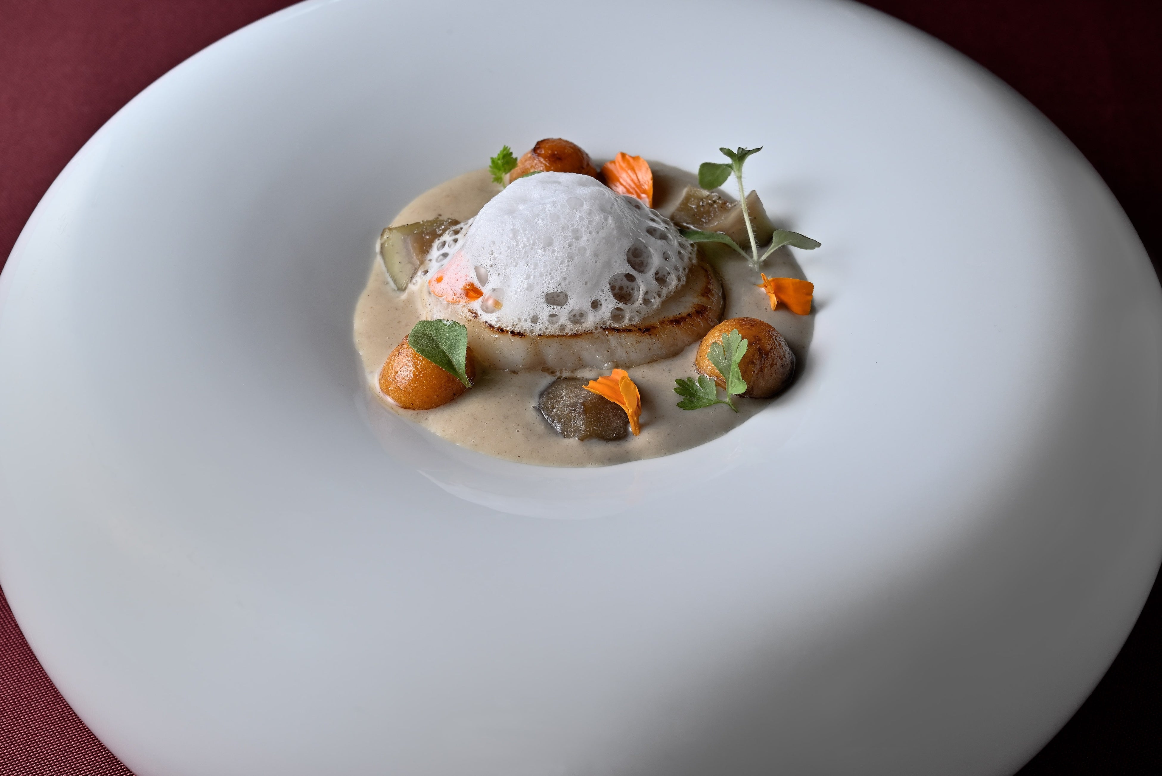 「筑波」栗を蒸してから焼き、香ばしさをまとわせてからピューレにし、クリームやバターと合わせることでコクのある優しい味わいの栗のソースが完成。焦しバターで仕上げた栗とカリッと焼き色をつけた帆立の塩味に、風味豊かな栗のソースがよく合う。