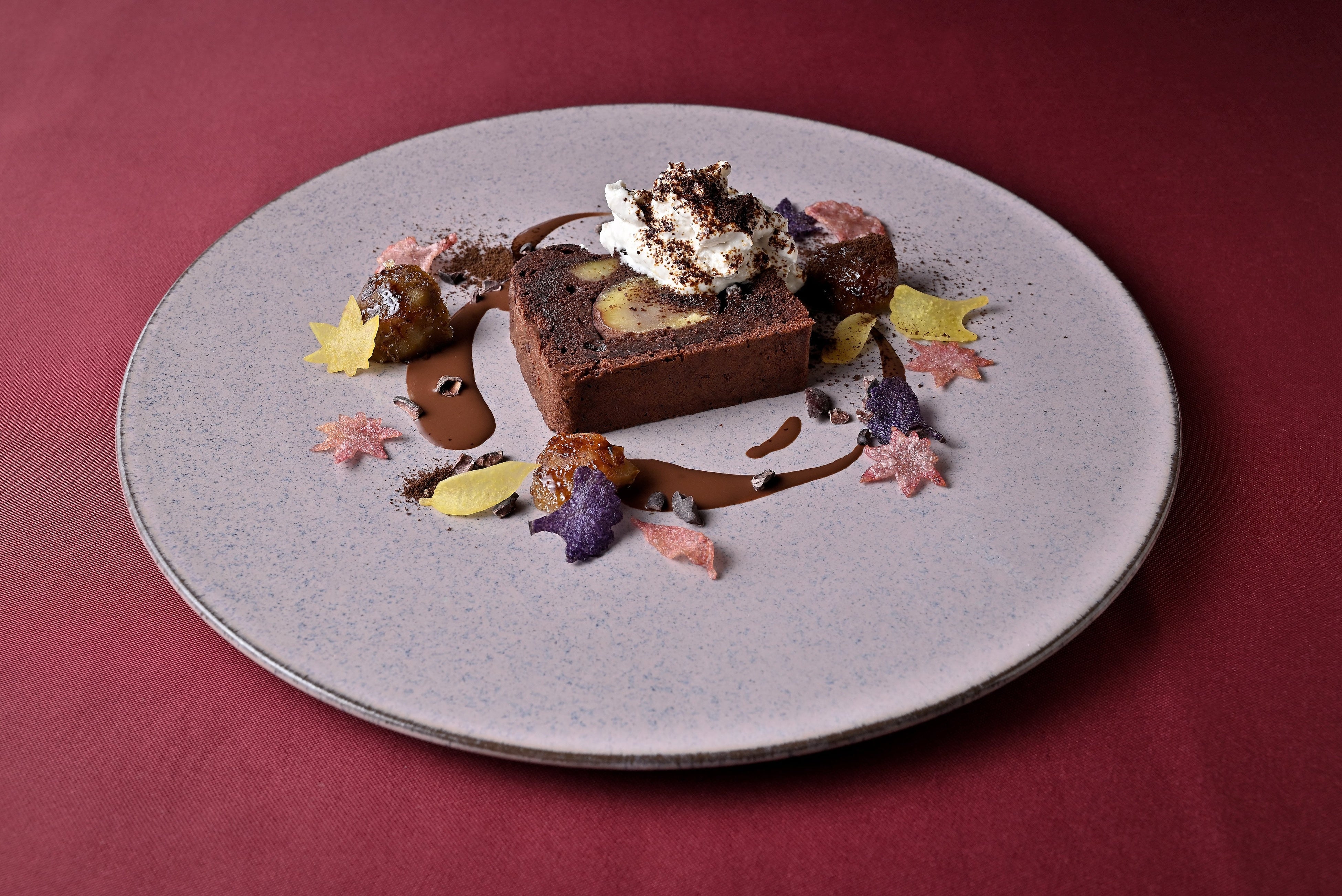 氷蔵熟成で甘みがのった「丹沢」栗を茹で、ホクホクとした食感はガトーショコラとの相性が抜群。まわりにあしらった栗はキャラメリゼし、少しほろ苦さを出している。季節感あふれる和栗のデセールとしてお楽しみいただきたい。