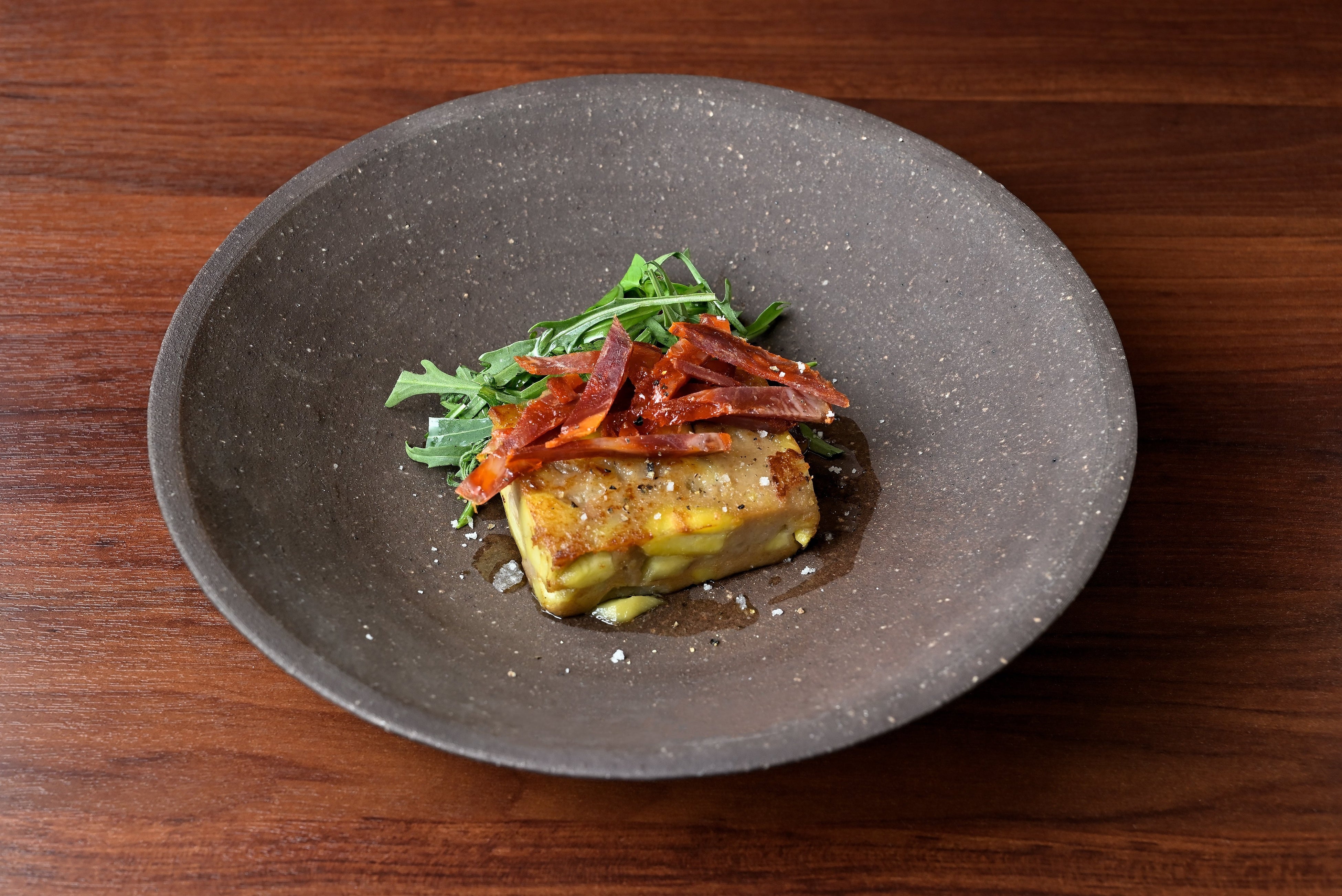 「筑波」の栗をポレンタと合わせた、和洋折衷の一品。ポレンタに鶏のだしで煮た栗を加え、冷やし固める。焼き色を付けて笠間焼の器に盛り、細切りにしたイベリコ豚のチョリソーとミックスハーブを添えて提供。口の中で旨味が渾然一体となって広がる。