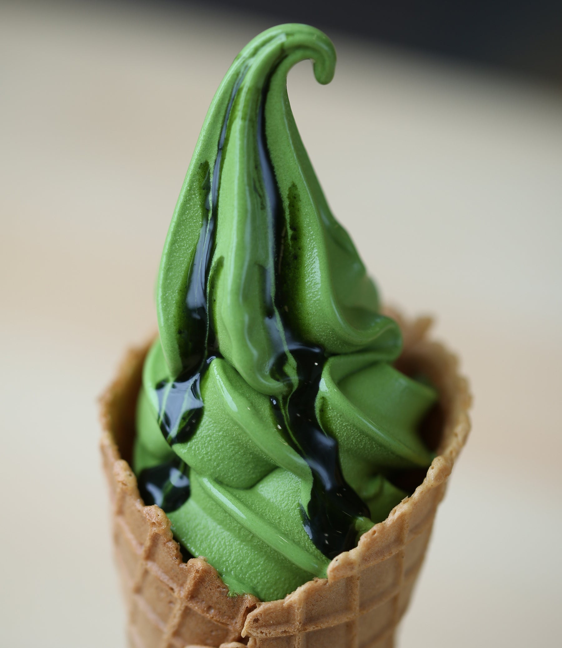 京都でたったひとつの村 、南山城村の茶畑を望む道の駅から。村の人たちが大切に育てた特産品 “ 村茶 ”を使った濃いお茶のスイーツがSNSでバズッて大人気!最近では、口溶けがクリーミーな新商品のブリュレが登場するなど大人気の道の駅です。中でも注目は、春摘み抹茶をたっぷり使った “ 村抹茶ソフトクリーム ” 。春摘みならではのほのかな苦みと濃厚な旨みに、さらに“追い抹茶”のソースで抹茶尽くしな味わいです。鮮やかなグリーンがお茶好きにはたまりません!