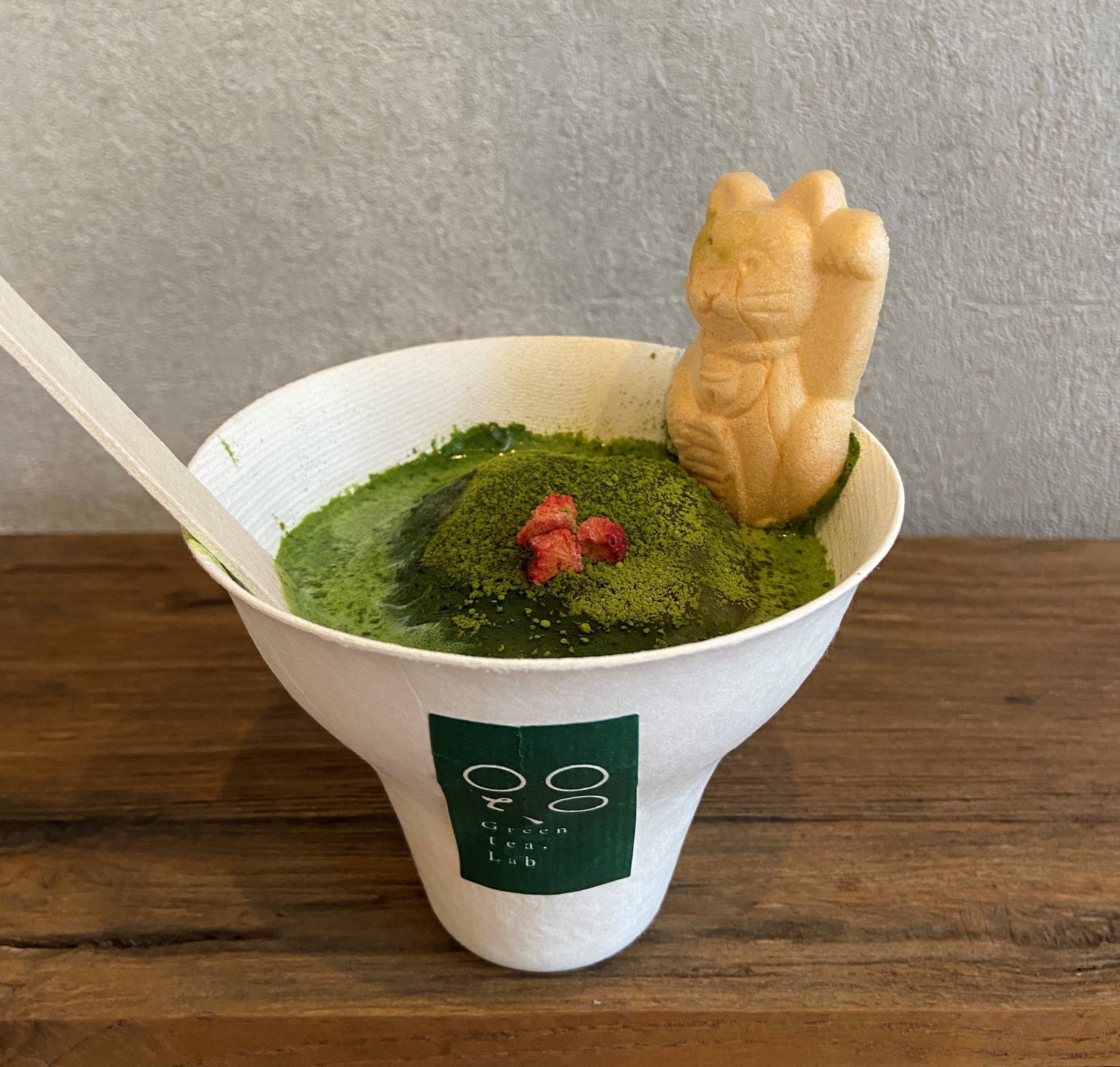 初代が茶の木を植えて90年以上 、生産から販売まで手掛ける「お茶の富澤 」がプロデュースする「 Greentea.Lab」は 、日本茶の新しい魅力を日々研究、研鑽するお店。今回おすすめのお茶は、“ 温茶 ” 。あたたかなおいしさと癒しに包まれる冬にぴったりの日本茶です。ほかに、同じ益城町でお芋の生産から販売までを手掛け、“いきなり団子 ”で有名な「芋屋長兵衛」とコラボしたスイーツも登場。かわいい招き猫のもなかと一緒に召し上がれ♪