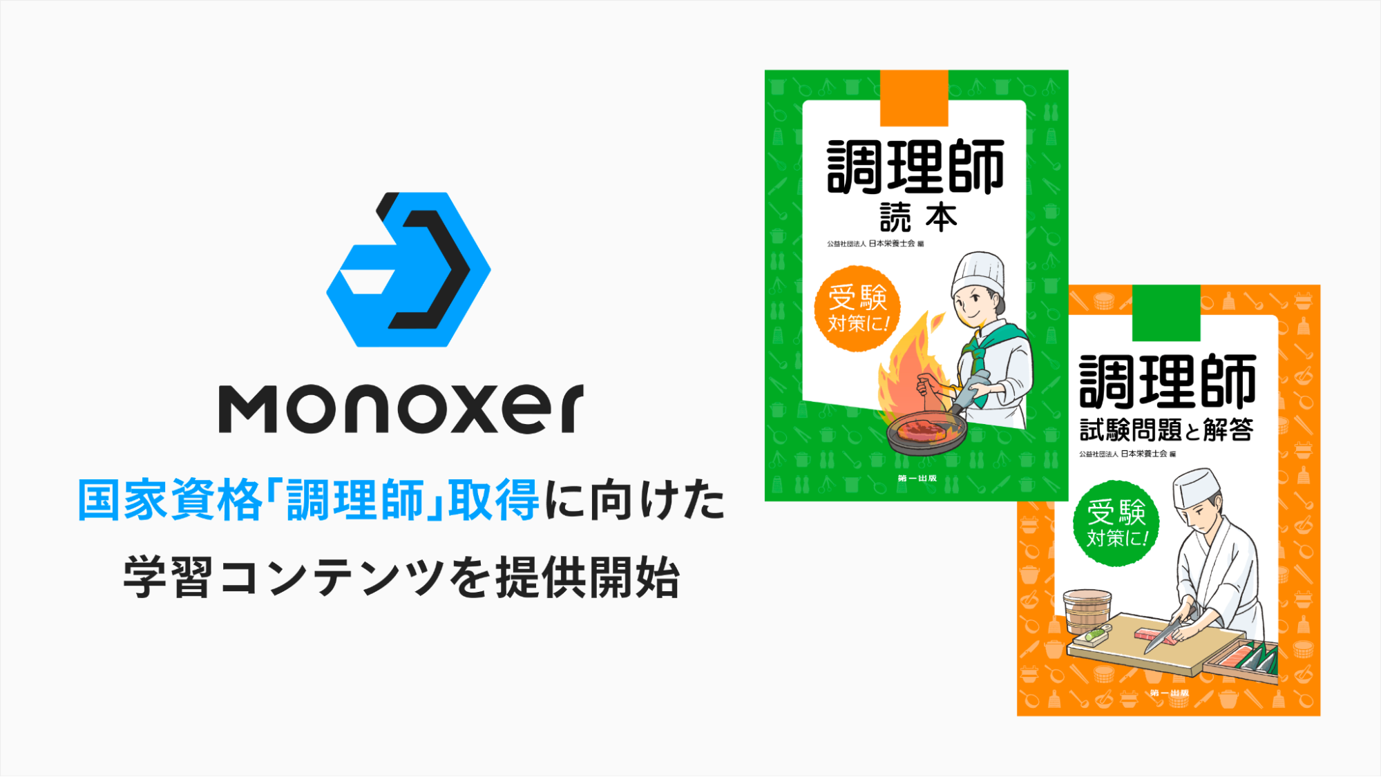 モノグサ株式会社(東京都千代田区 代表取締役:竹内孝太朗、畔柳圭佑)は記憶定着のための学習プラットフォーム「Monoxer(モノグサ)」が、第一出版株式会社(東京都千代田区 代表取締役:井上由香、以下第一出版)よりライセンスを受け、Monoxer上で「調理師」資格取得のための学習コンテンツを導入組織に向けて2023年度にリリースすることをお知らせいたします。