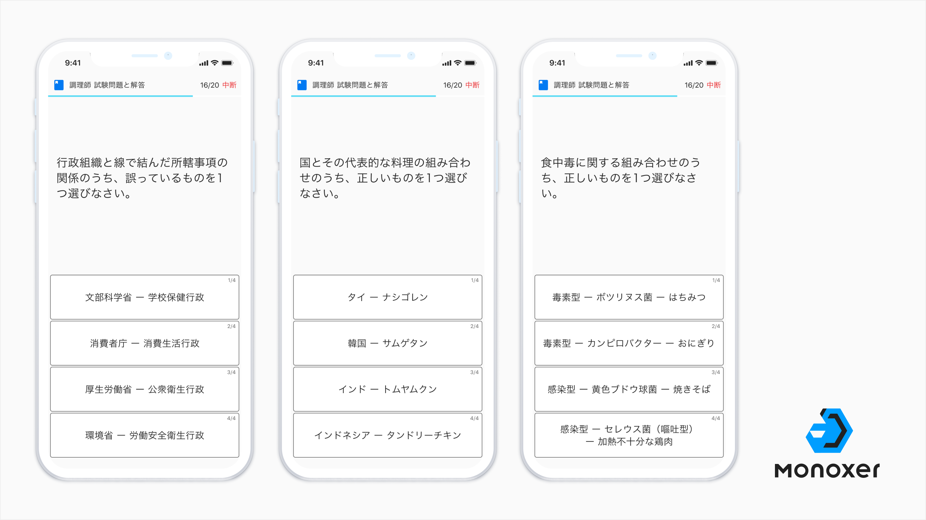 健康・栄養・食品に関する専門書を中心に出版している第一出版のロングセラー『調理師読本』、『調理師試験問題と解答』をベースにMonoxer上の学習コンテンツを作成しています。