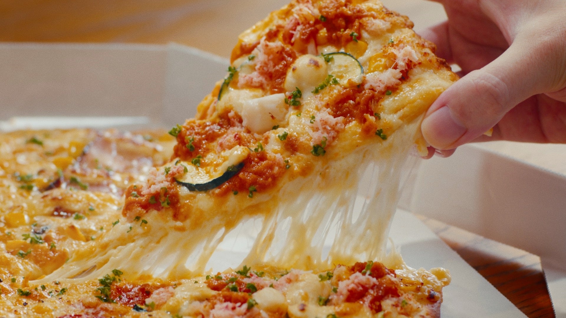 撮影合間のランチタイム。ピザーラが用意されていることに驚き、テンションが上がる二人。富澤さんが箱をあけると、中からこの冬の新商品「紅ズワイのグルメクォーター」が湯気の中から現れて、「うわぁ」と思わず声が漏れます。