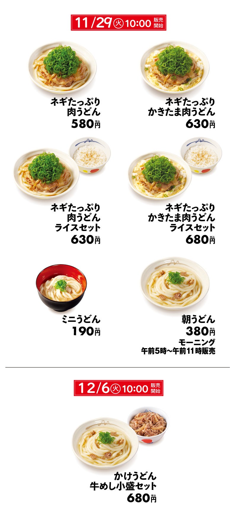 | 商品名 【11月29日(火)販売開始】 ネギたっぷり肉うどん 580円 ネギたっぷりかきたま肉うどん 630円 ネギたっぷり肉うどんライスセット 630円 ネギたっぷりかきたま肉うどんライスセット 680円 ミニうどん 190円 朝うどん(午前5時~午前11時販売) 380円 【12月6日(火)販売開始】 かけうどん牛めし小盛セット 680円 ※お持ち帰りいただけません。 ※みそ汁は付きません。 ※全て税込み価格です。 発売日 2022年11月29日(火)午前10時 ~ |