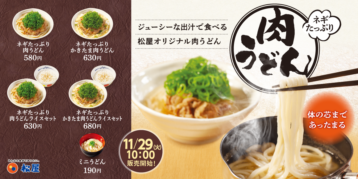 このたび松屋フーズ(本社:東京都武蔵野市、代表取締役社長:瓦葺一利)では、牛めし・カレー・定食・その他丼の「松屋」におきまして、2022年11月29日(火)午前10時より「ネギたっぷり肉うどん」を発売いたします。