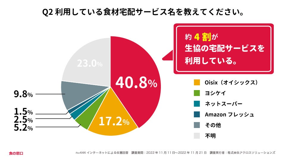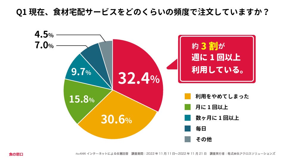 株式会社アクロスソリューションズと一般社団法人 日本唐揚協会が共同運営している食の窓口(URL:https://karaage.ne.jp/contents/ )は、20歳〜59歳の男女444人を対象に「食材宅配の利用者にアンケート調査」を実施しました。